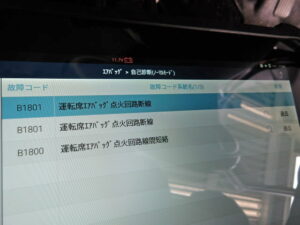 診断機は、ダイアグコードB1801の運転席エアバッグ点火回路断線、