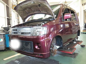 車検で入庫のZ10のキューブも説明しながら一緒に作業、