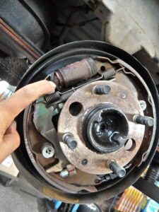 リヤのブレーキシューは前側2枚、ブレーキオイル交換、